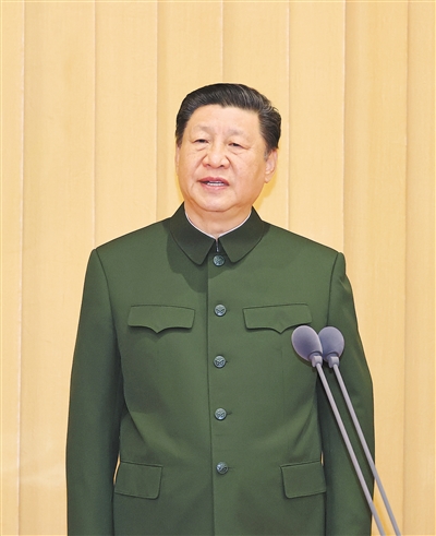 4月19日,中国人民解放军信息支援部队成立大会在北京八一大楼隆重举行。中共中央总书记、国家主席、中央军委主席习近平向信息支援部队授予军旗并致训词。这是习近平致训词。新华社记者 李 刚摄