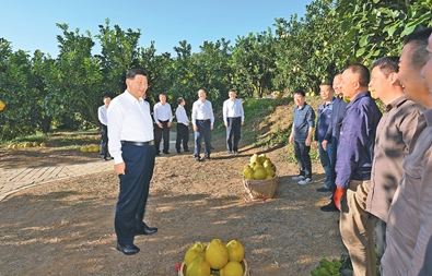 金柚是梅州的特色农产品。正值收获季节,柚子园硕果累累。习近平来到雁洋镇南福金柚种植基地,在展示厅听取广东加大对革命老区支持力度、推进乡村全面振兴等情况汇报,察看柚子及其加工产品、文创产品。他走进果林,同果农和农技人员亲切交流。得知今年金柚喜获丰收、销路畅通,习近平十分高兴。他指出,发展乡村特色产业是推进乡村全面振兴的基础,要加强科技应用,推动农文旅融合,不断延伸产业链、增加附加值,带动更多农民群众增收致富。