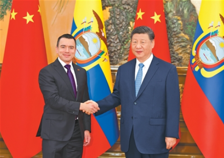 习近平指出,今年是中厄建交45周年,两国关系发展势头良好。厄瓜多尔加入共建“一带一路”大家庭,双方签署自由贸易协定,在能源、矿业、电力、基础设施建设等领域开展了富有成效的合作。中方始终从战略高度和长远角度看待和发展中厄关系,愿同厄方一道努力,推动中厄全面战略伙伴关系不断走深走实,更好造福两国人民。