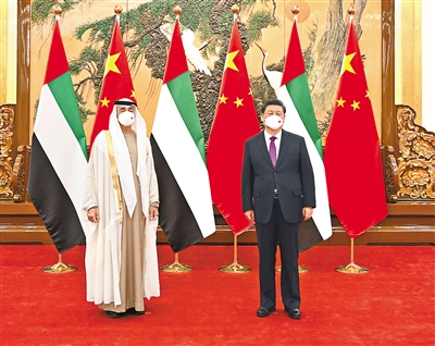 穆罕默德表示,中国是我的第二故乡,我很高兴再次访华。祝伟大的中国不断发展进步,相信北京冬奥会必将取得圆满成功。阿中两国拥有牢固政治互信和兄弟般的情谊,两国全面战略伙伴关系达到前所未有的高水平,在政治、经济等广泛领域均取得令人骄傲的显著成果。阿方将加强对华关系置于阿联酋外交最优先位置,致力于不断巩固深化阿中全面战略伙伴关系。阿方愿同中方继续坚定相互支持,拓展工业、能源、投资、高技术、金融以及疫苗药物研发生产等领域合作,推动“一带一路”倡议在中东地区更好落地。阿方坚定恪守一个中国原则,愿同中方加强在联合国等多边场合协调合作。