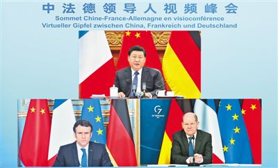 3月8日下午,国家主席习近平在北京同法国总统马克龙、德国总理朔尔茨举行视频峰会。新华社记者 黄敬文摄