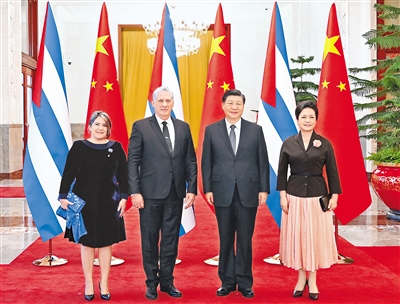 11月25日,中共中央总书记、国家主席习近平在北京人民大会堂同来华进行国事访问的古巴共产党中央委员会第一书记、古巴国家主席迪亚斯—卡内尔举行会谈。会谈前,习近平在人民大会堂北大厅为迪亚斯—卡内尔举行欢迎仪式。这是习近平和夫人彭丽媛同迪亚斯—卡内尔和夫人奎斯塔合影。新华社记者 申 宏摄