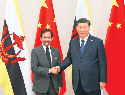 当地时间11月16日下午,国家主席习近平在旧金山会见文莱苏丹哈桑纳尔。