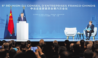 当地时间五月六日下午,国家主席习近平在巴黎同法国总统马克龙共同出席中法企业家委员会第六次会议闭幕式,并发表题为《继往开来,携手开创中法合作新时代》的重要致辞。新华社记者 翟健岚摄
