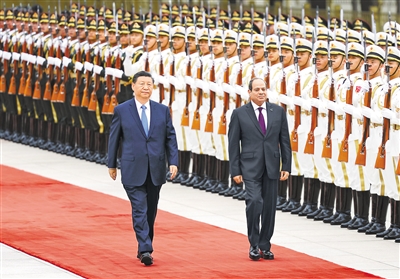 塞西抵达时,礼兵列队致敬。两国元首登上检阅台,军乐团奏中埃两国国歌,天安门广场鸣放21响礼炮。塞西在习近平陪同下检阅中国人民解放军仪仗队,并观看分列式。
