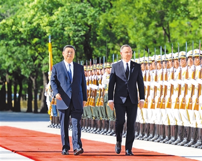6月24日下午,国家主席习近平在北京人民大会堂同来华进行国事访问的波兰总统杜达举行会谈。这是会谈前,习近平在人民大会堂东门外广场为杜达举行欢迎仪式。新华社记者 翟健岚摄