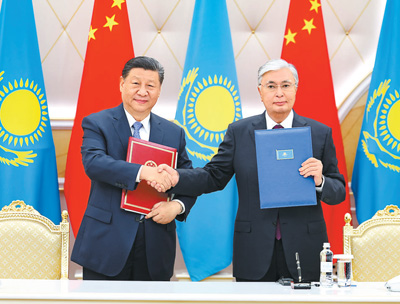托卡耶夫表示,习近平主席对哈萨克斯坦进行国事访问,再次证明哈中双方均高度重视并强烈希望进一步提升哈中永久全面战略伙伴关系。哈中有着跨越千年的牢固友谊,各领域合作成果丰硕。特别是近年来,在习近平主席亲自关心引领下,哈中关系迈入了新的“黄金时代”,两国重大合作项目进展顺利,农业、绿色能源、人文等领域合作取得积极成果,为增进两国人民福祉作出贡献。哈萨克斯坦坚定恪守一个中国原则,是中国可以信赖的朋友和伙伴。深化对华友好战略合作,是哈方坚定不移的战略优先。哈方高度赞赏中国秉持的和平外交理念以及习近平主席提出的系列全球倡议,高度评价中方为促进世界和平和发展作出的重要贡献,愿同中方共同努力,推进构建哈中命运共同体和人类命运共同体。哈方期待同中方认真落实习近平主席这次访问的重要成果,持续高质量共建“一带一路”,全力实现双边贸易额翻番的目标,加强农业、经贸、新能源、跨境电商、电动汽车等领域合作,加快推进跨里海国际运输路线建设。哈方欢迎设立哈中文化中心和鲁班工坊,积极办好明年“中国旅游年”,密切两国地方合作和教育、文化等人文领域交流合作。哈方将继续积极参与中国—中亚机制建设,密切同中方在上海合作组织、联合国等多边框架内的协调配合。