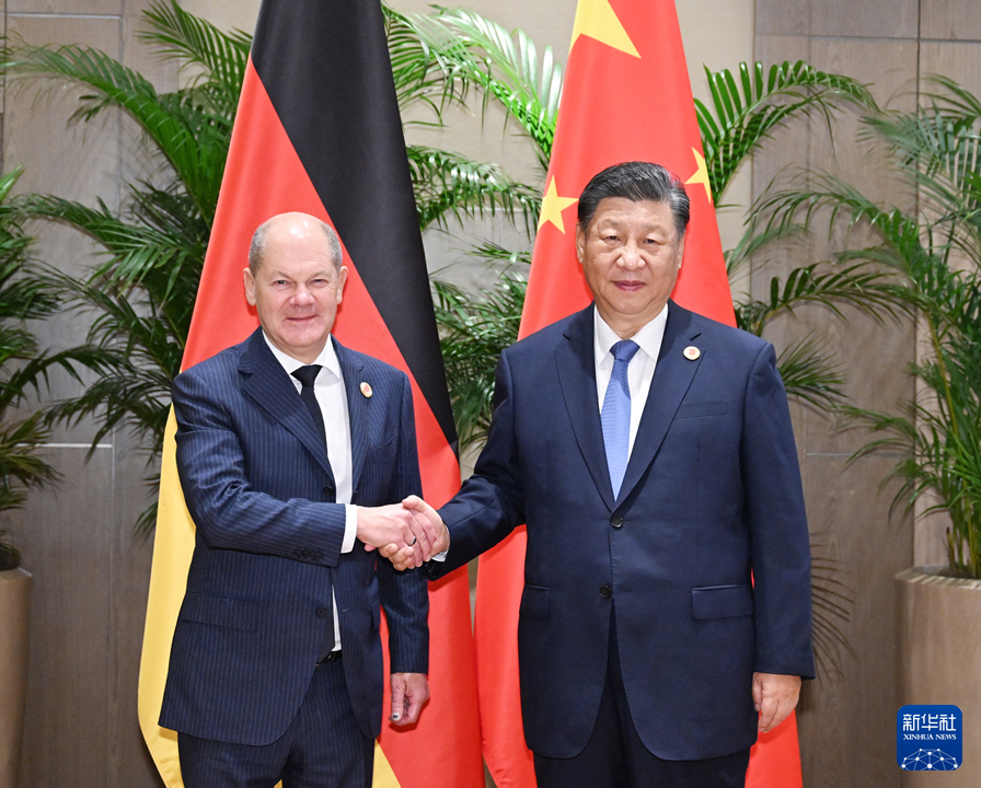 当地时间11月19日上午,国家主席习近平在里约热内卢出席二十国集团领导人峰会期间会见德国总理朔尔茨。新华社记者 谢环驰摄