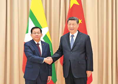 习近平指出,中缅是同甘共苦、守望相助的命运共同体。中缅两国共同倡导的和平共处五项原则和万隆精神历久弥坚,时代价值不断凸显。今年是两国建交75周年,中方将秉持睦邻、安邻、富邻、亲诚惠容、命运与共的理念方针,同缅方深化命运共同体建设,高质量共建“一带一路”,落实好全球发展倡议、全球安全倡议、全球文明倡议,给两国人民带来更多福祉。前不久,缅甸曼德勒强烈地震造成重大人员伤亡和财产损失,中方最早派出救援力量,援助紧急人道主义物资,愿继续提供帮助,支持缅方重建家园。中方支持缅甸走符合本国国情的发展道路,维护主权独立、领土完整、国家稳定,稳妥推进国内政治议程。双方要深化战略合作,持续推进中缅经济走廊重点项目建设。希望缅方切实保障在缅中方人员、机构、项目安全,加力打击网赌电诈等跨境犯罪。双方要共同捍卫以联合国为核心的国际体系和以国际法为基础的国际秩序,维护发展中国家正当权益。