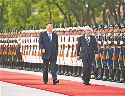 5月13日下午,国家主席习近平在北京人民大会堂同来华进行国事访问的巴西总统卢拉举行会谈。这是会谈前,习近平在人民大会堂东门外广场为卢拉举行欢迎仪式。新华社记者  燕  雁摄