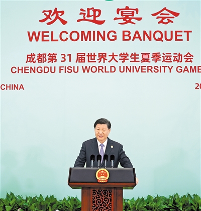 习近平发表致辞,代表中国政府和中国人民对来华出席成都第31届世界大学生夏季运动会开幕式的国际贵宾表示热烈欢迎。(致辞全文见第三版)