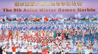 二月七日,第九届亚洲冬季运动会开幕式在黑龙江省哈尔滨市举行。图为演员在开幕式上表演。新华社记者 杨 磊摄