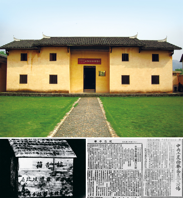 在中央苏区、延安时期,我们党探索了一套对苏维埃政府、边区政府和革命根据地人民政权组织及其工作人员的监督办法。 上图为江西瑞金中华苏维埃共和国工农检察委员会旧址;下左图为当年江西兴国县高兴区苏维埃政府工农检察部设置的控告箱;下右图为《红色中华》报关于中央印刷厂等单位贪污案查处结果和检举于都县苏维埃工作人员营私贪污案的报道。 中共江西省赣州市委党史办供图