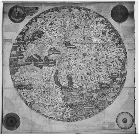 图23 1459年欧洲人的世界地图。可以看到地图上似乎巨细靡遗,就算是当时欧洲人根本一无所知的南非地区,都有密密麻麻的信息。