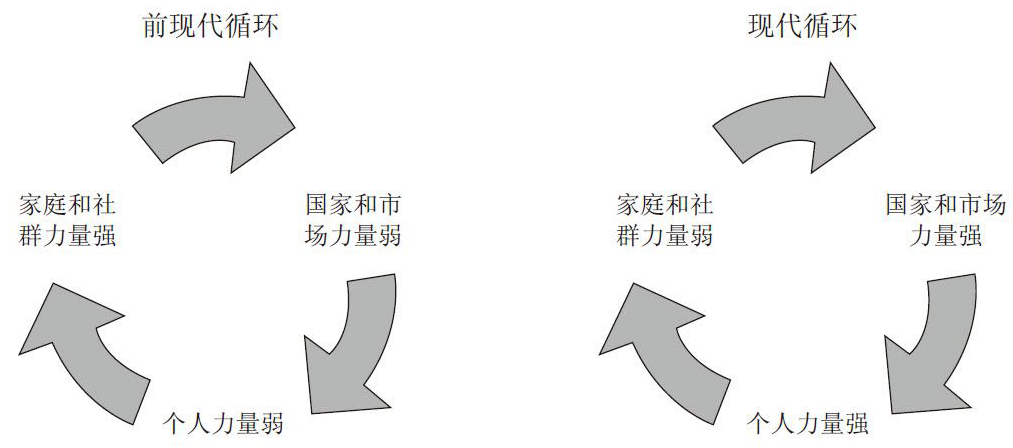 于是,国家与市场找上家庭和社群的各个成员,开出了他们无法拒绝的条件。他们说:“做自己吧!想娶想嫁都随你的意,别管父母准不准。想挑什么工作都可以,别担心什么大家长说的话。想住哪就住哪,就算没办法每周和家人吃上一次饭又有什么关系呢?你不用再依赖家庭或社群了。我们,也就是国家和市场,让我们来照顾你吧。我们会给你食物、住房、教育、保健、福利和就业机会。我们也会给你退休金、保险和保障。”