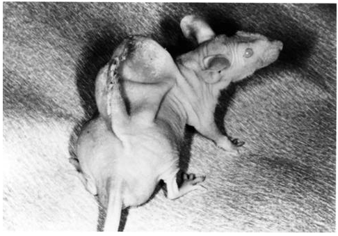 图27 在这只老鼠背上,科学家用牛软骨细胞让它长出一只“耳朵”。这可以说是以一种怪诞的方式响应着施泰德洞穴里的狮人雕像。在3万年前,人类就已经有了想要结合不同物种的幻想,而今天我们真的有能力制造出这种嵌合体了(chimera,指由两个以上不同遗传结构的组织组成的个体或器官)。