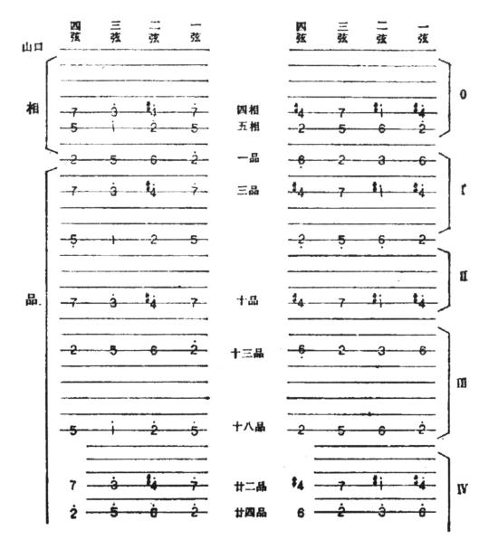 人工泛音:左手手指按在任何相、品上的位置,当作山口切弦段,然后在切弦段的1/2、1/3、1/4……处,用右手小指按泛音,同时右手食指在上面拨弦,发出清亮透明的泛音。