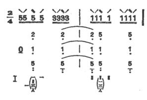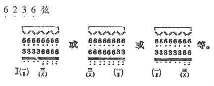 (2)浦东传派有此奏法,每组共有四声,叫做“夹扫”。大都可连续反复进行。变奏形式虽多,但常用的有下列几种:
