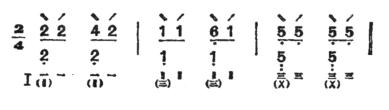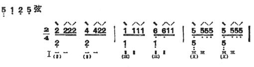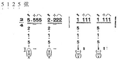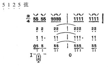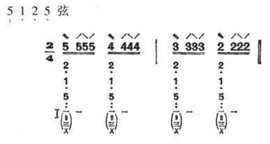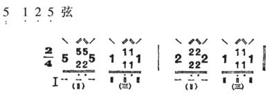 ②快夹弹:由时值相等的四个音组成。第一音双弹两条弦(本弦和本弦右面的空弦音或按音),第二音挑一条本弦,第三音弹一条本弦,第四音挑一条本弦,共得四声。大都可连续反复进行。例如: