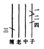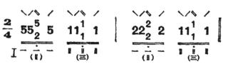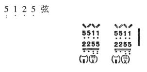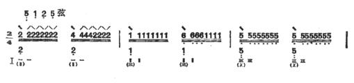 ①夹扫:由时值相等的四个音组成。第一音弹一条本弦,第二音拂本弦和其他几条弦,第三音划本弦和其他几条弦,第四音挑一条本弦。例如: