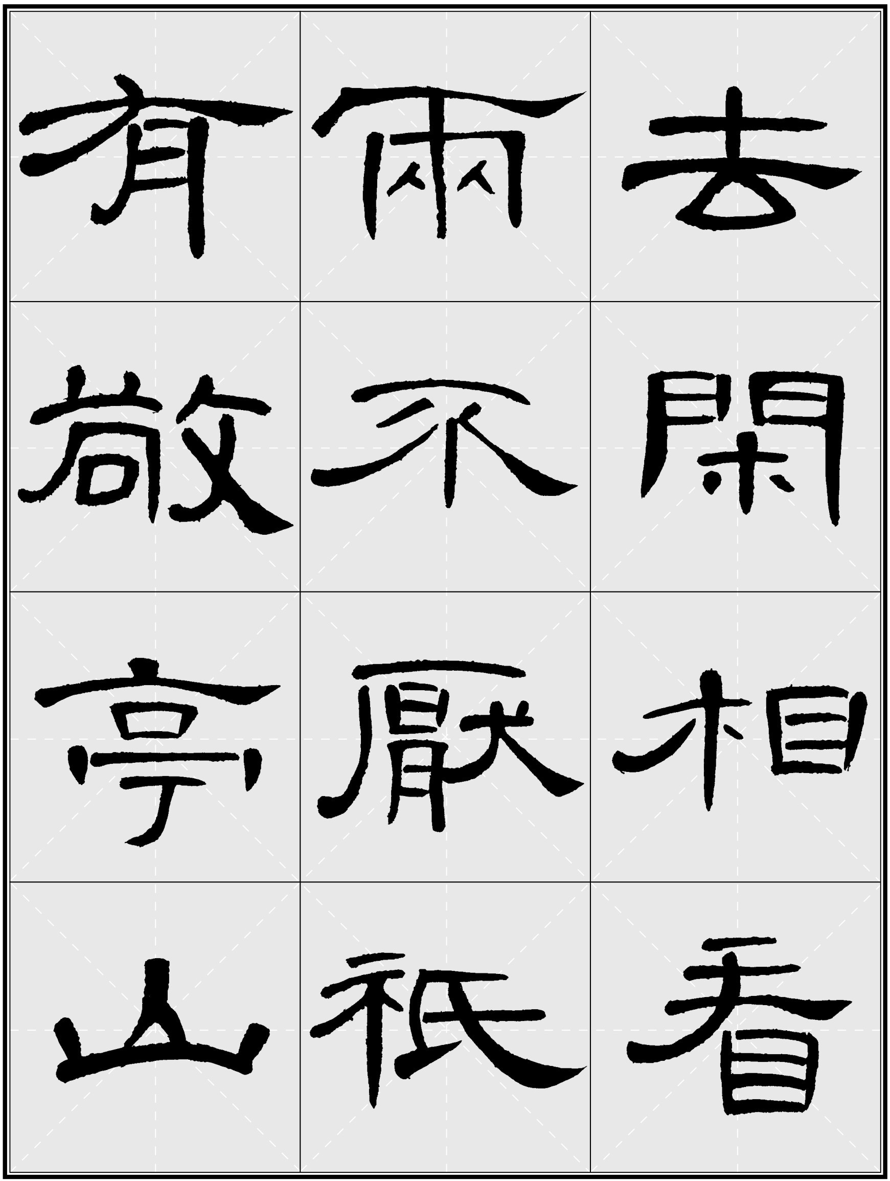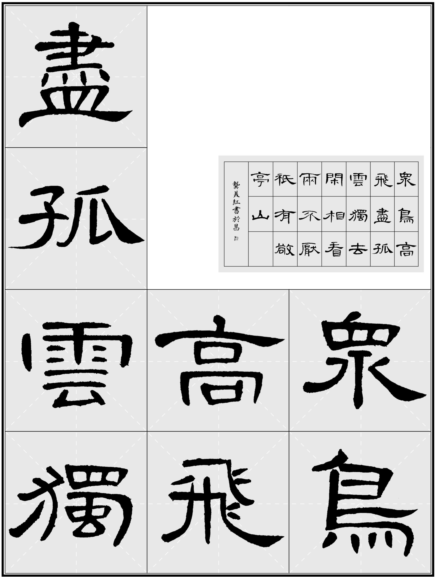 【临创提示】本幅作品采用二尺横幅的幅式,规格为68厘米*34厘米,画界格书写,每个格子长宽比在1∶1.5至1∶2之间。隶书大多字形偏扁,结体中正平和,这种画界格书写方式,以及字距大、行距小和横平竖直的章法处理比较适合隶书。在这幅作品中,“两(兩)、不、去”等字虽然笔画较少,但书写难度不小,结构切忌松散。落款用楷书,在工整端稳方面与正文比较协调,内容写上书写的时间、地点、作者姓名等,注意字体大小要小于正文,上下不能与正文齐平,在此前提下适当靠上。末尾钤一方名章,与落款相隔半个字到一个字的距离。