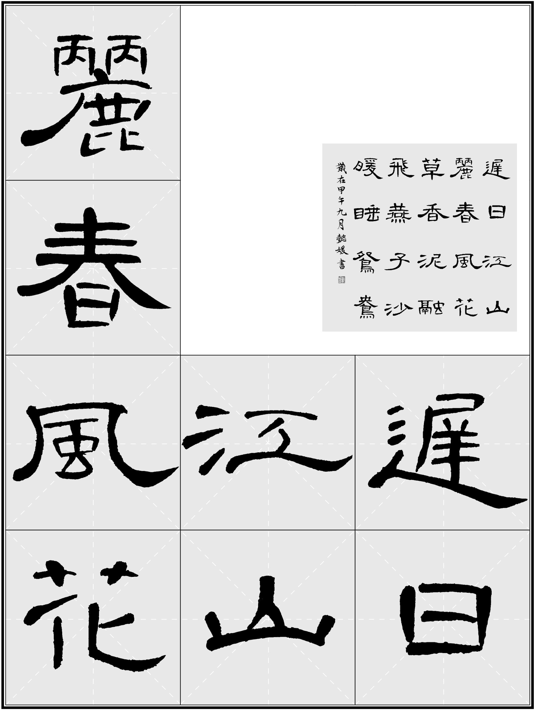 正文中的“丽(麗)、燕、睡、鸳(鴛)、鸯(鴦)”等字结构复杂,笔画繁多,宜把笔画写得略细和紧密一些,运笔时还要注意间架结构的匀称,使整幅作品给人以平衡协调之感。