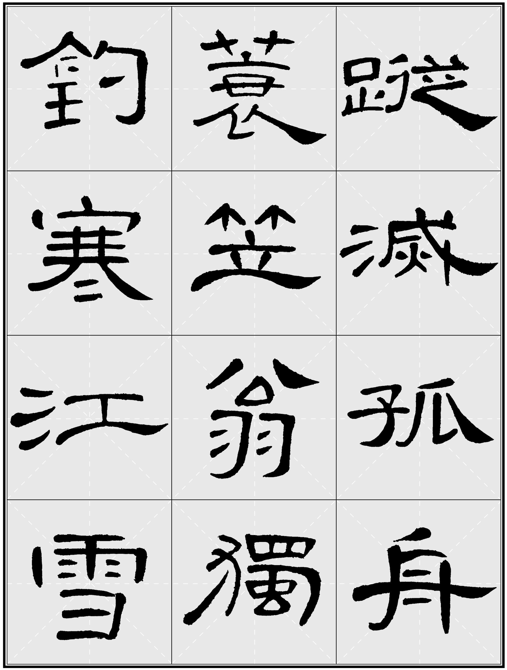 在书写中,要注意左右两字之间的位置处理,如“绝(絶)”与“灭(滅)”、“江”与“笠”,字间要注意穿插避让,不要粘连拥挤,笔画要清晰,穿插要得体。