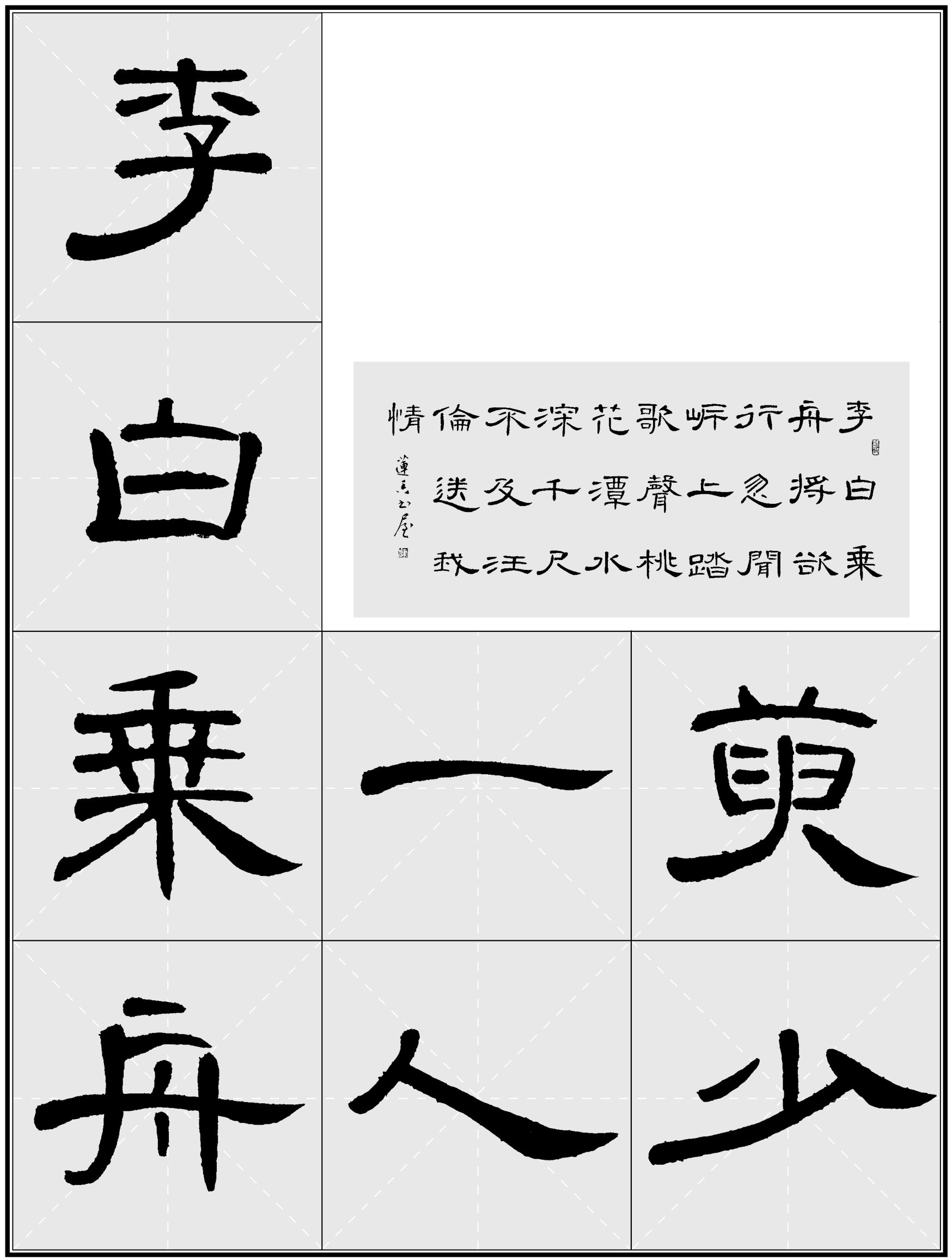 【临创提示】 此作采用三尺横幅的款式(34厘米* 100厘米),正文分成十行,每行三个字,最后一行一个字,可直接落款。“李、白”两字处略显空虚,可在两字之间加盖一方引首章。
