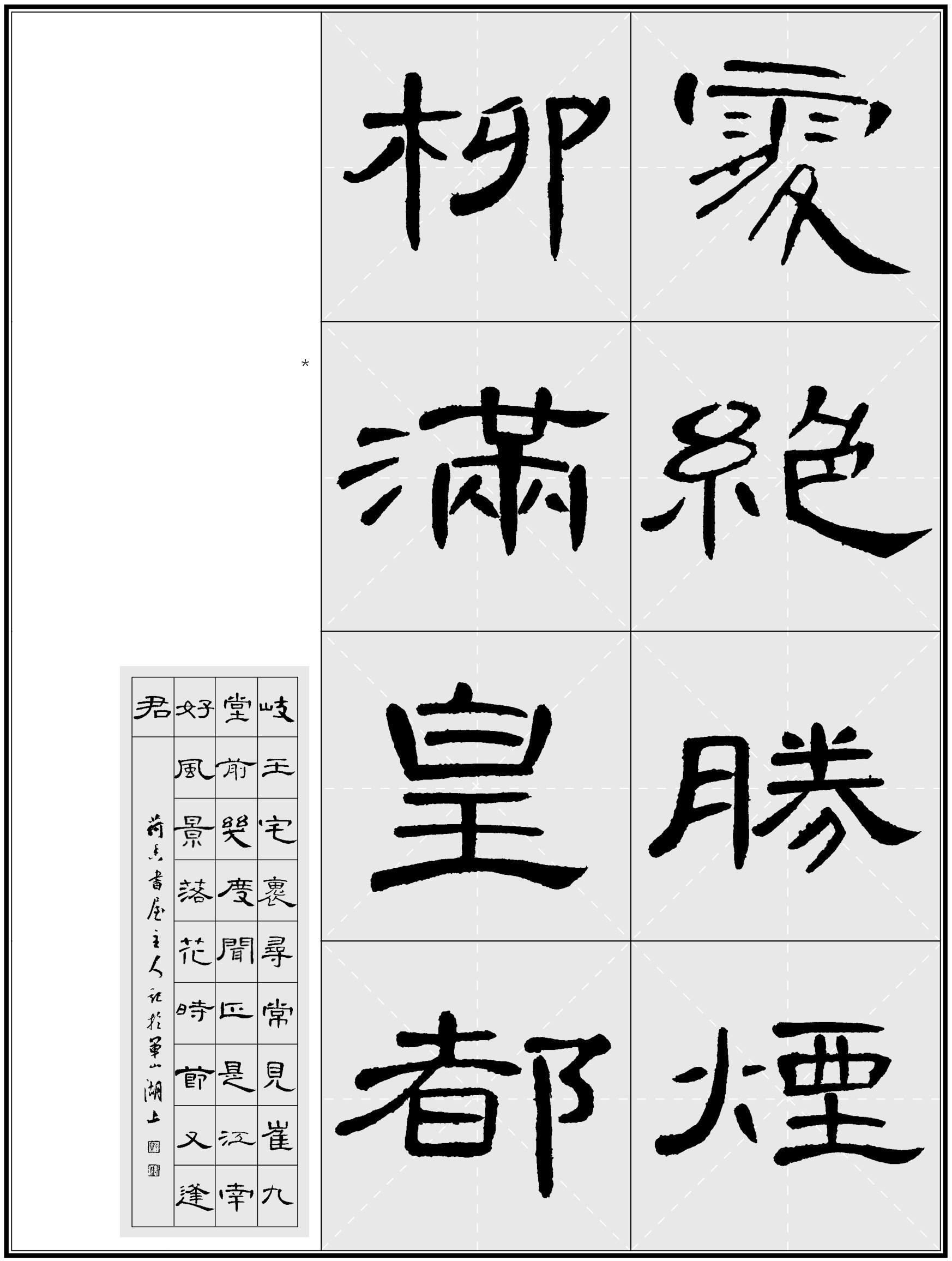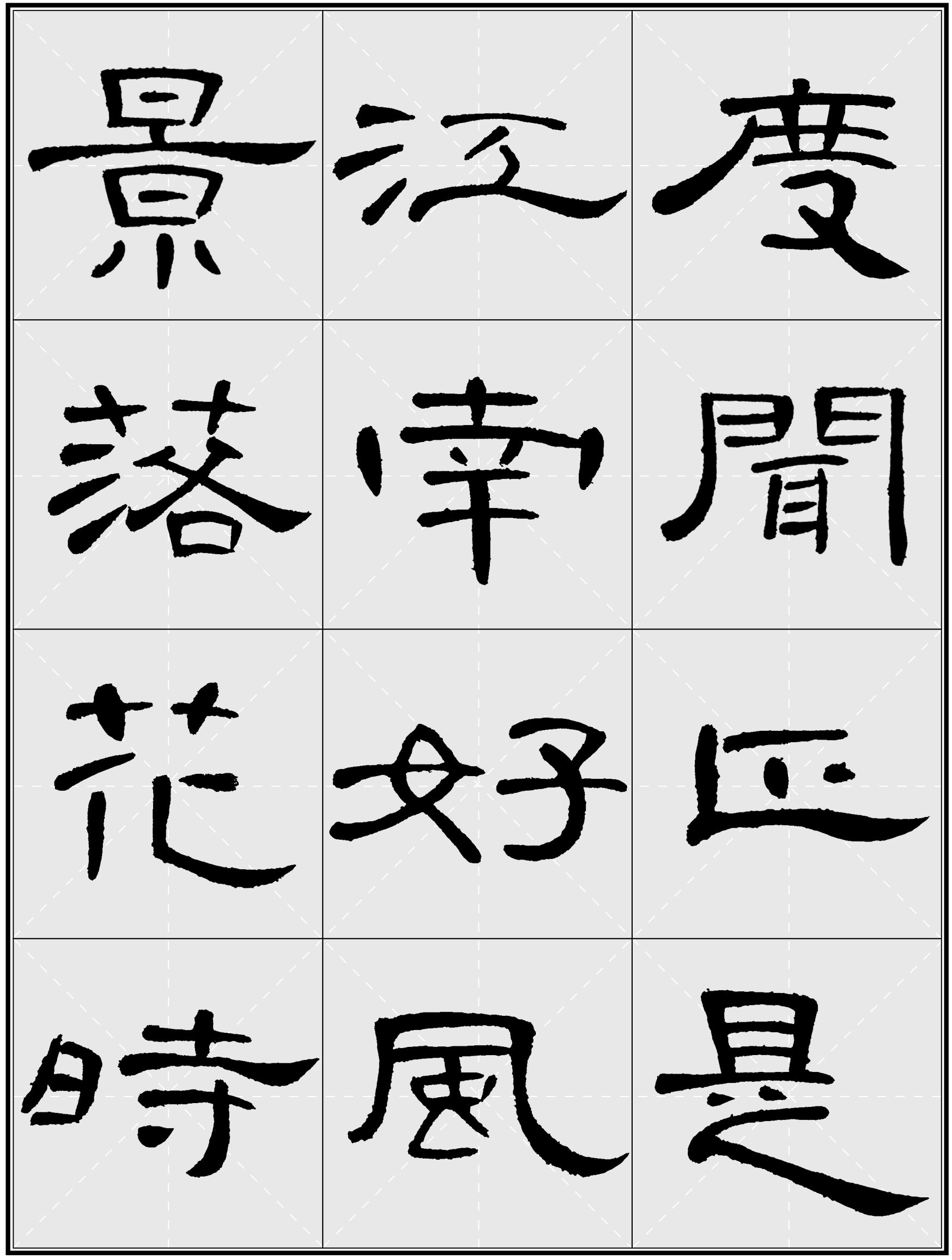 书写时,不要一味地追求扁方的结构和左右舒展的态势,而要根据每个字的笔画多少、字本身的结体特点和自然形态来决定字的宽窄、长短和形状,如“王、好、又”等字可以写得上下收紧、左右舒展,而“里(裏)、见(見)、景”等字则要写得相对狭长。