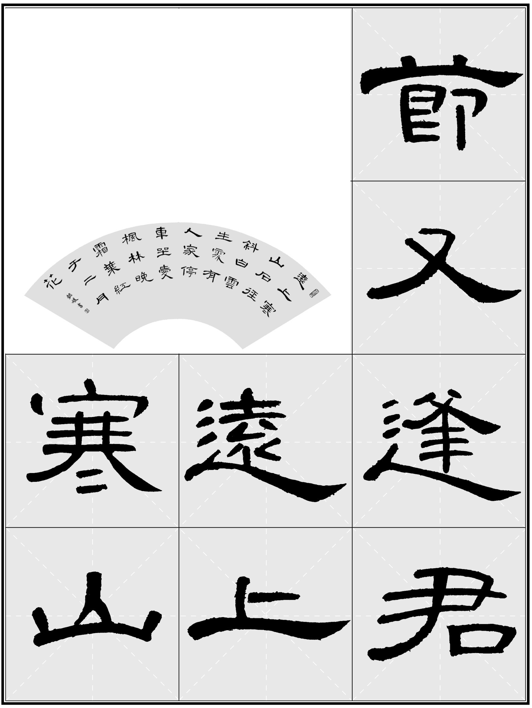 【临创提示】 这幅作品采用的是折扇幅式,一行三个字,最后一行只有一个字,可接着落穷款,只写书者名。