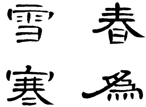 分布均匀 隶书笔画排列大致整齐匀称,各部件的空间分割比例恰到好处,使笔画和留空间距停匀,追求整体均衡美观的视觉效果,如“雪、春、寒、为 (為)”四字。