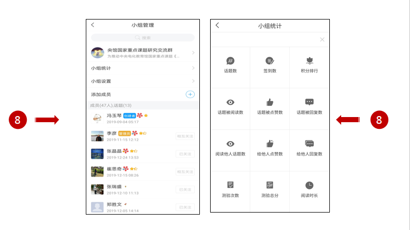 第八步:提供“小组统计”,帮助课题负责人直观课题成员参与情况。