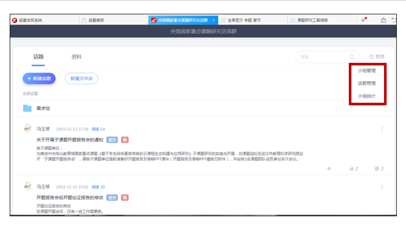 第四步:小组还提供了“小组管理”、“话题管理”和“小组统计”功能,便于直观了解研究的各种数据。