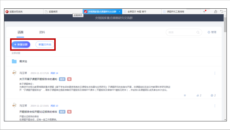 第三步:小组提供了“新建话题”和“新建文件夹”两个主要功能。