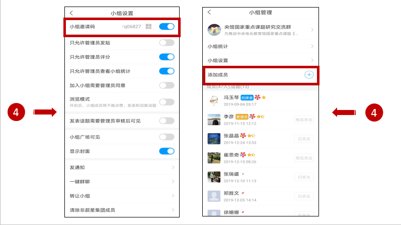 第四步:我们可以点击“小组设置”,将邀请码发送给身边的教研组老师;也可以通过“添加成员”的方式向同一单位的同仁发送小组申请。