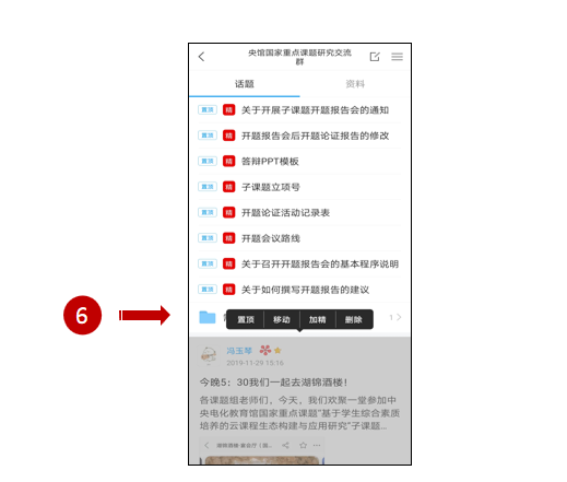 第六步:小组管理员还可以对于话题进行“置顶”“加精”“移动”“删除”等操作。