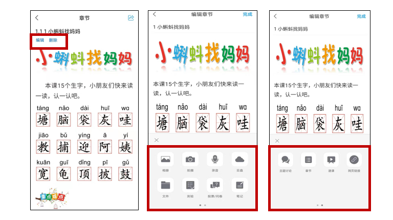 教师可对章节进行【编辑】或【删除】操作。点击【编辑】,提供多种富媒体工具,供老师们编辑章节内容。