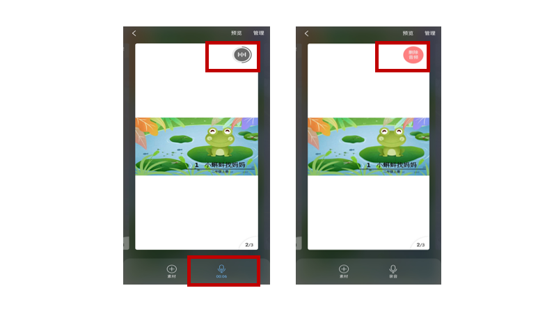 第四步:素材导入成功后,我们可以对其进行“录音”讲解。当然,如果不满意,还可以“删除录音”。
