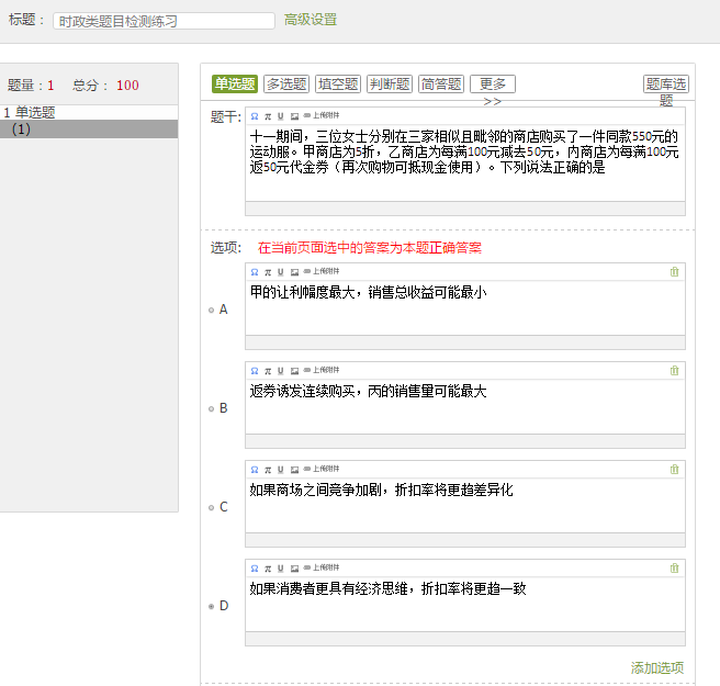 进入测验编辑页面,可以进行各种题型的测验编辑。我这先呈现选择题型的编辑页面,此时,可以将word中的题目复制粘贴过来(提醒:最好题干和题肢分开复制粘贴)。别忘了将正确选项前的圆点点击下,勾选上。然后就是点击页面最下端的保存设置了(别忘记了哦!!!)。