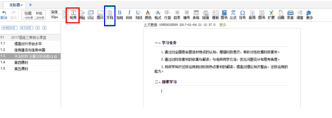 当然,在创作“微教学设计”这一部分的时候,完全可以把刚才你已经编辑好的“微教学设计”Word文档直接上传,更为简便快捷。图标见上图蓝色方框所示处。