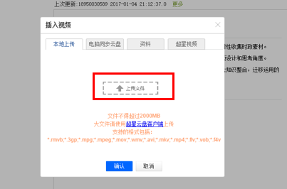 3.如插入视频,则点击工具栏中的视频按钮(上图红色框处),出现插入视频提示框,点击上传文件按钮(下图红色框处),即可选择已做好的微课上传(录制的微课视频格式为MP4或WMV格式,不然可能会遇到播放器兼容不了导致无法播放的问题),点击确认,即插入微课成功。