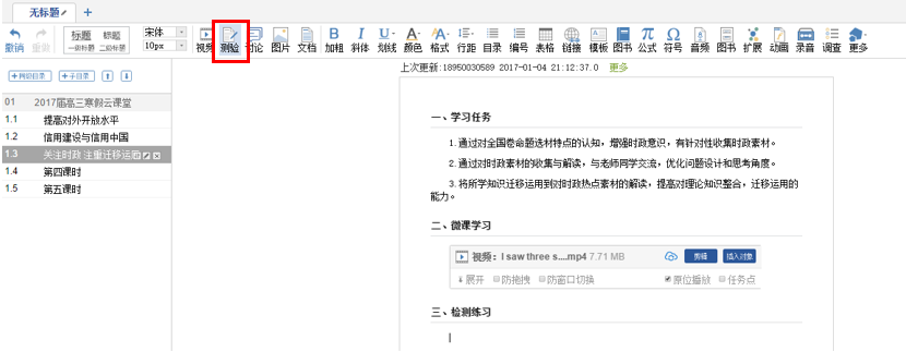 4.插入检测练习,点击测验按钮(下图红色框处)