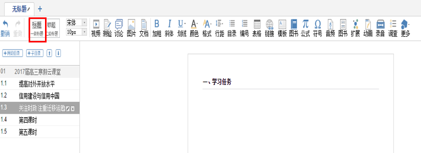 1.点击右边白色框内区域,即可进行课程内容编辑。点击一级标题按钮,在自动生成的横线上输入环节标题,如“一、学习任务”。