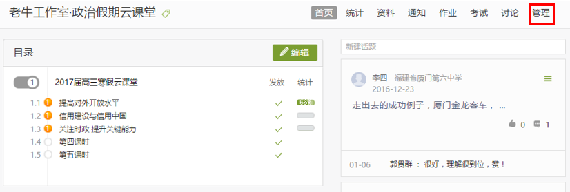 进入课程详细信息页面,点击页面右上角的管理按钮。(如下图)