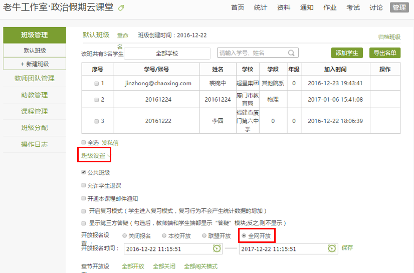 点击班级设置(页面中间红色框处),在弹出的下拉菜单中将开放报名设置的“全网开放”点选上(如下图右下红色框处)。这样学生才能进行课程学习报名,网站管理员也才能在后台找到你建的课程,进行课程学习推送。