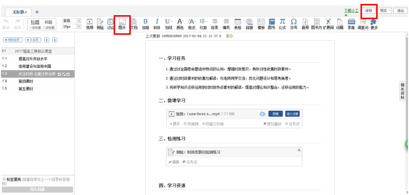 5.创建学习资源,操作如前。如果这一环节有呈现视频,上传方法参照前面。如有图片,上传方法参照视频上传方法。也可以引用链接。或直接从网页上复制粘贴过来。