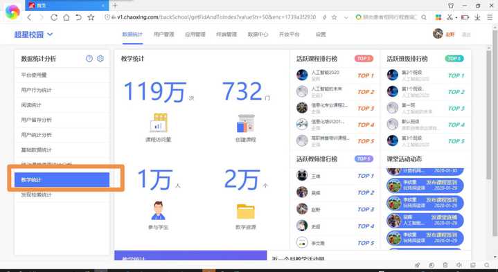 管理者可通过微服务平台对教学统计、课程访问量、创建课程情况、参与学生、教学资源、活跃课程排行榜、活跃班级排行榜、活跃教师排行榜、课堂活动动态、近一个月教学活动量等进行查看和管理。