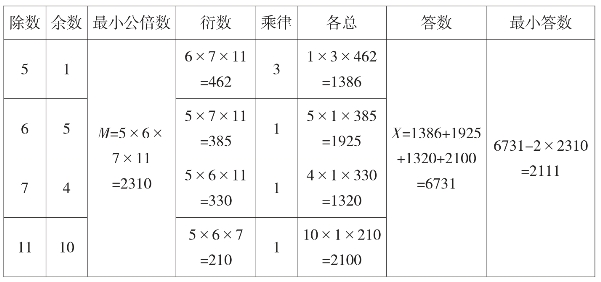 《孙子算经》所提供的方法本质上也是解一次同余式的一般方法,解题的关键在于求乘律,也就是解3个(余数是1)独立的同余式: