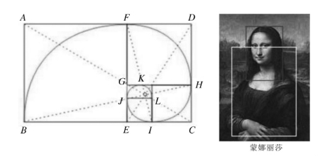 )/2≈0.618,此时长边为短边的1.618倍,就称这个矩形为黄金矩形。事实上,在一个黄金矩形中,以矩形的较短边为边作一个内接正方形,这时,原矩形分成两部分,一个正方形,一个小的新矩形,而这个矩形仍然是一个黄金矩形(如矩形ECDF),这个操作可以无限重复下去,就会产生无数个黄金矩形(如:ECHG,EIKG,JLKG,…)。