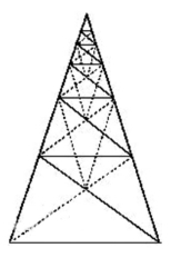 顶角为36°的黄金三角形是一个等腰三角形,它的底与它的腰成黄金比。当底角被平分时,两角平分线分对边也成黄金比,并形成两个较小的黄金三角形,这两个三角形相似于原三角形,类似的也可以产生无数个黄金三角形(如右图)。